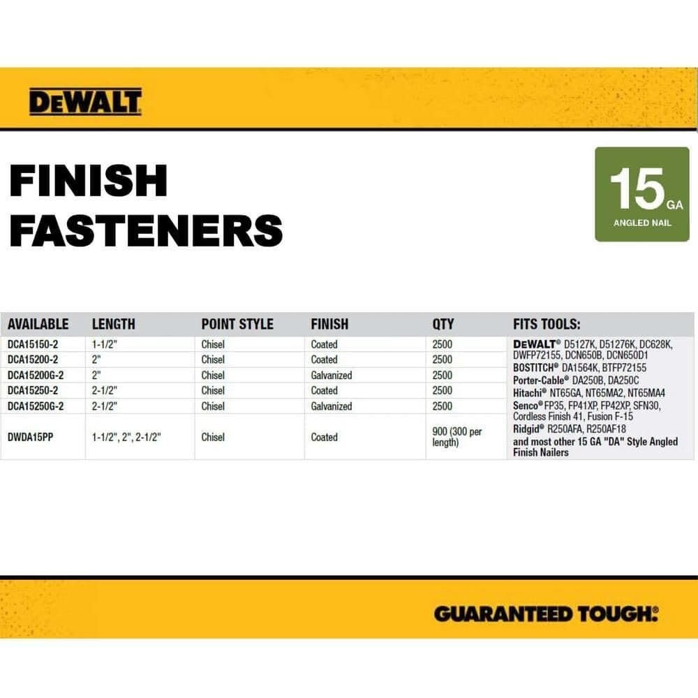 DEWALT’s 15 Gauge Angled Finish Nails are manufactured to our highest standards and engineered to work seamlessly with DEWALT 15 Gauge Angled Finish Nailers. Choose from the full range of DEWALT 15 gauge angled finish nail lengths and pack sizes available [sold separately] to complete various finishing projects.