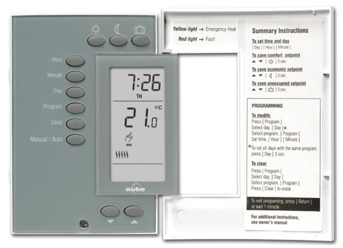 This versatile Aube by Honeywell 7-Day Programmable Thermostat controls systems from millivolt to 240-Volt and is also well-suited for hot water heating. Advanced temperature control ensures total comfort by minimizing temperature swings. Selectable cycles mean thermostat can be optimized to heating system. Pump protection activates pump for one minute every 24-hours to prevent seizure. Armchair Programming – convenient Programming by removing faceplate from base. Precise LCD shows room temperature in increments of 0.1-Degree Celsius or 0.1-Degree Fahrenheit