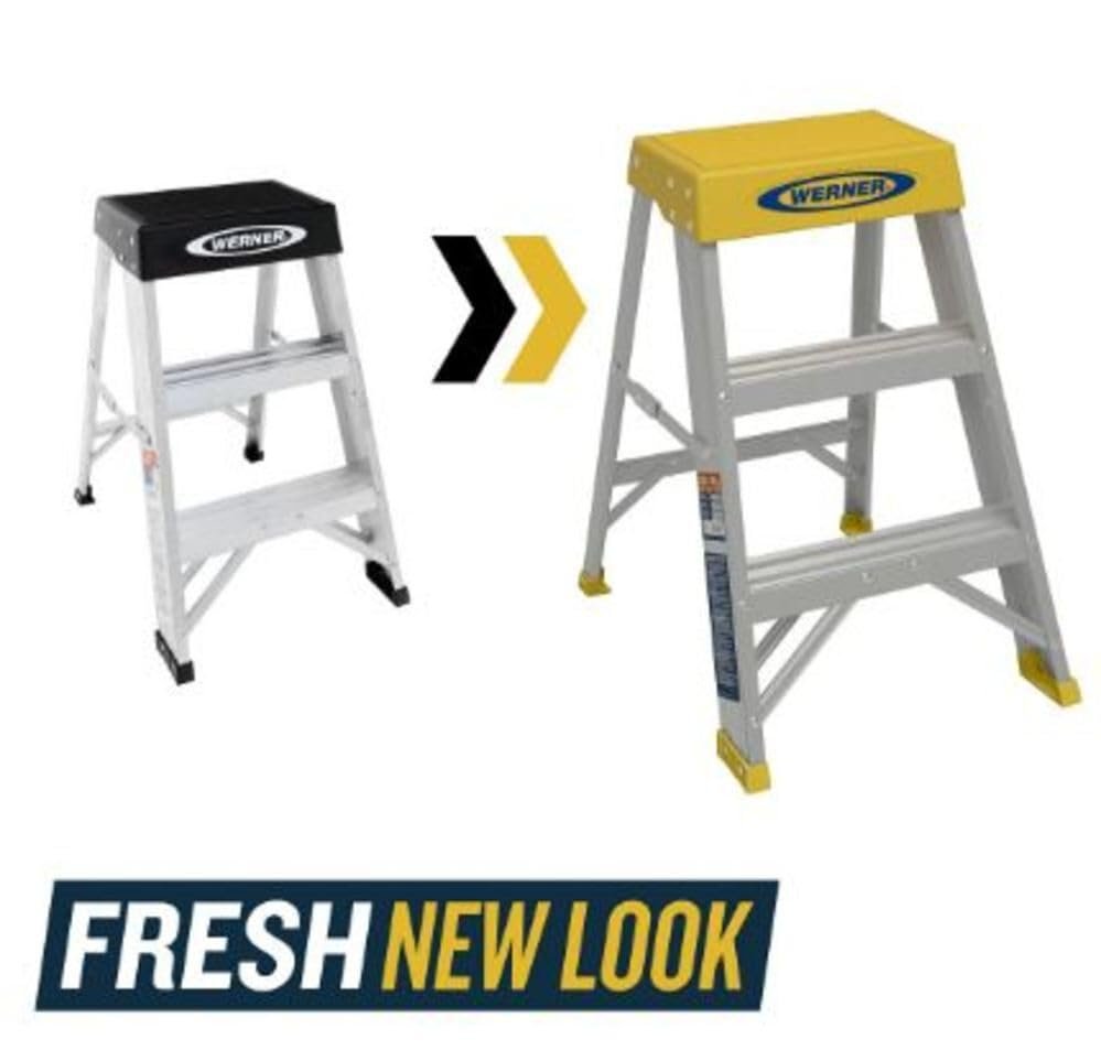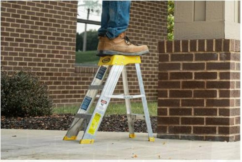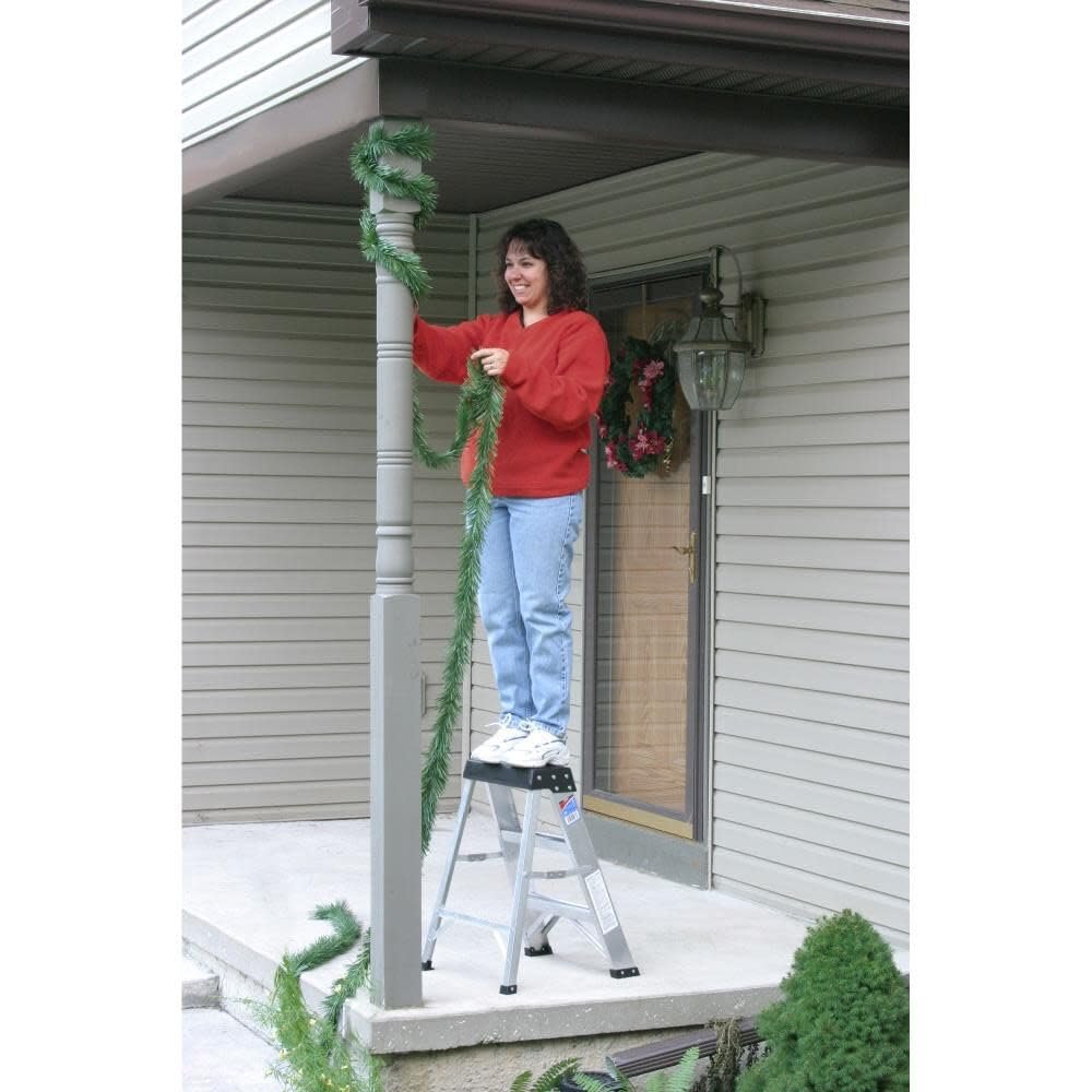 This 2-foot heavy duty aluminum stepstool with a sturdy molded plastic top has a 300 pound duty rating, Type 1A. The molded plastic top provides a large standing platform. Features include external Pinch-Proof spreaders, slip-resistant Traction-Tred steps and molded vinyl-foot pads riveted to the rails. The bottom step has double channel braces. Highest standing level is 2 feet.