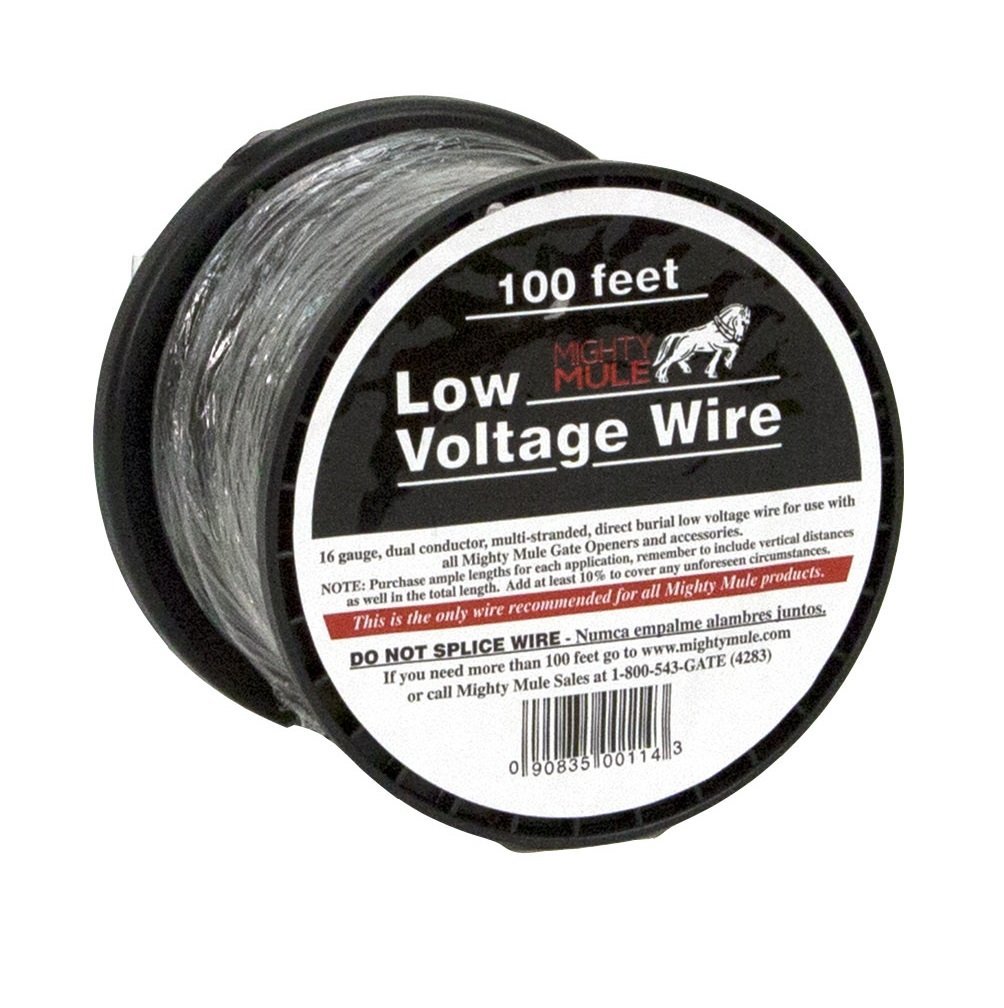 Mighty Mule 100′, 16 gauge, multi-stranded, dual conductor low voltage wire can be used for installing an AC transformer, solar panel, wireless intercom/keypad, or most other automatic gate opener accessories. This wire is UV treated and PVC coated, and is rated for direct burial. However, GTO recommends running the wire through conduit or PVC pipe in order to protect it from the elements and ensure longer life for your wire.