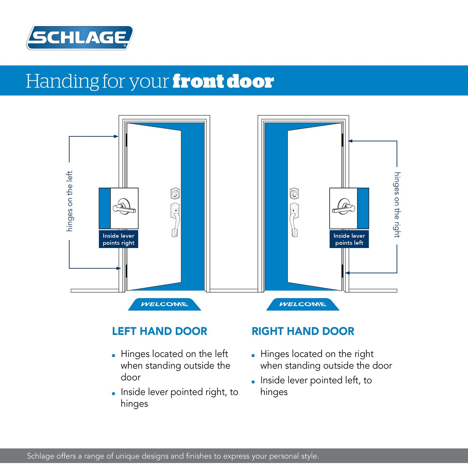 This Schlage handleset features a decorative deadbolt, matching exterior handleset grip and interior passage door knob or lever. Offering premium construction combined with a sleek design and industry-leading warranty, this is the perfect door handleset for your customized entryway. Trust your home to Schlage, makers of high-quality, innovative door hardware for over 100 years.