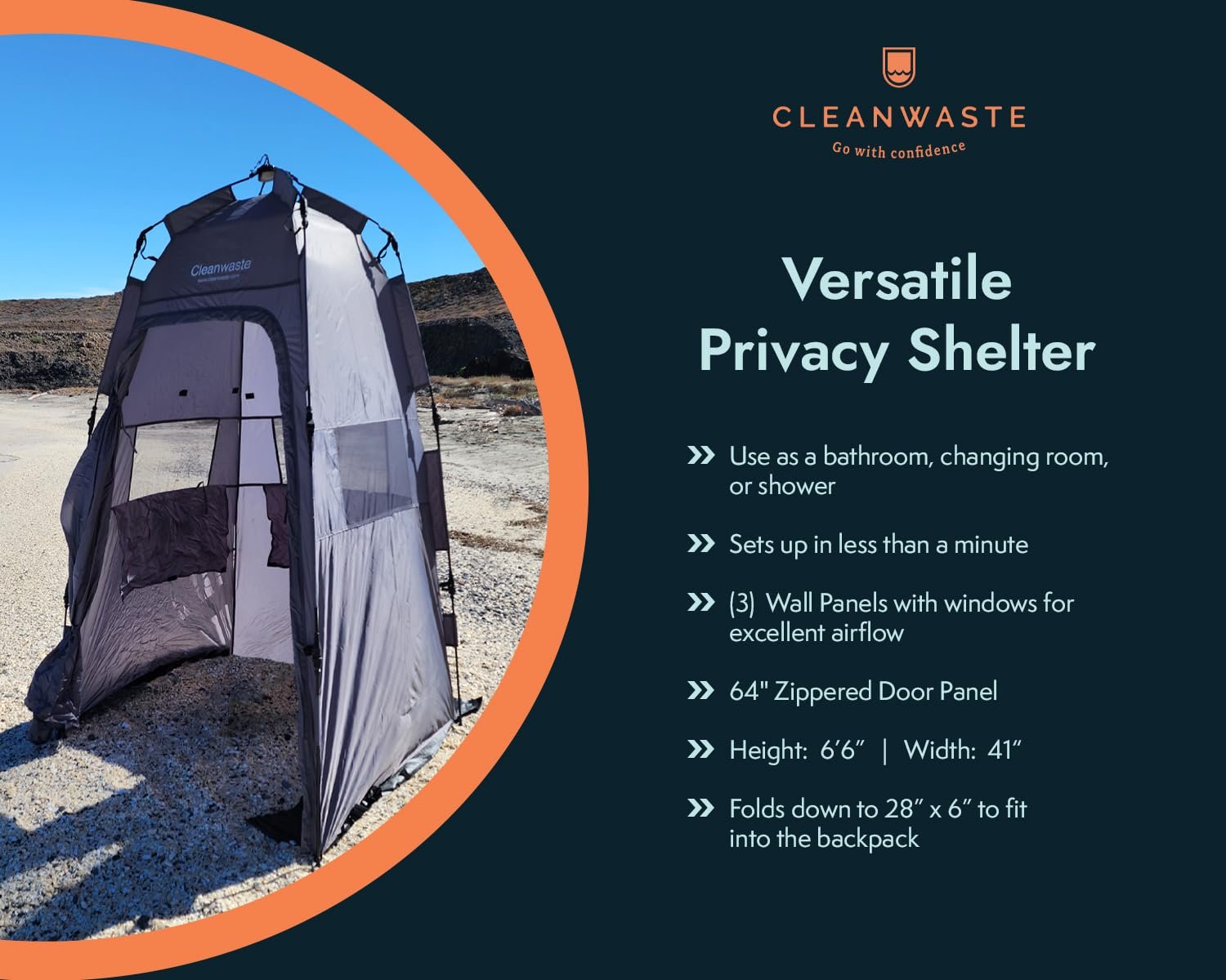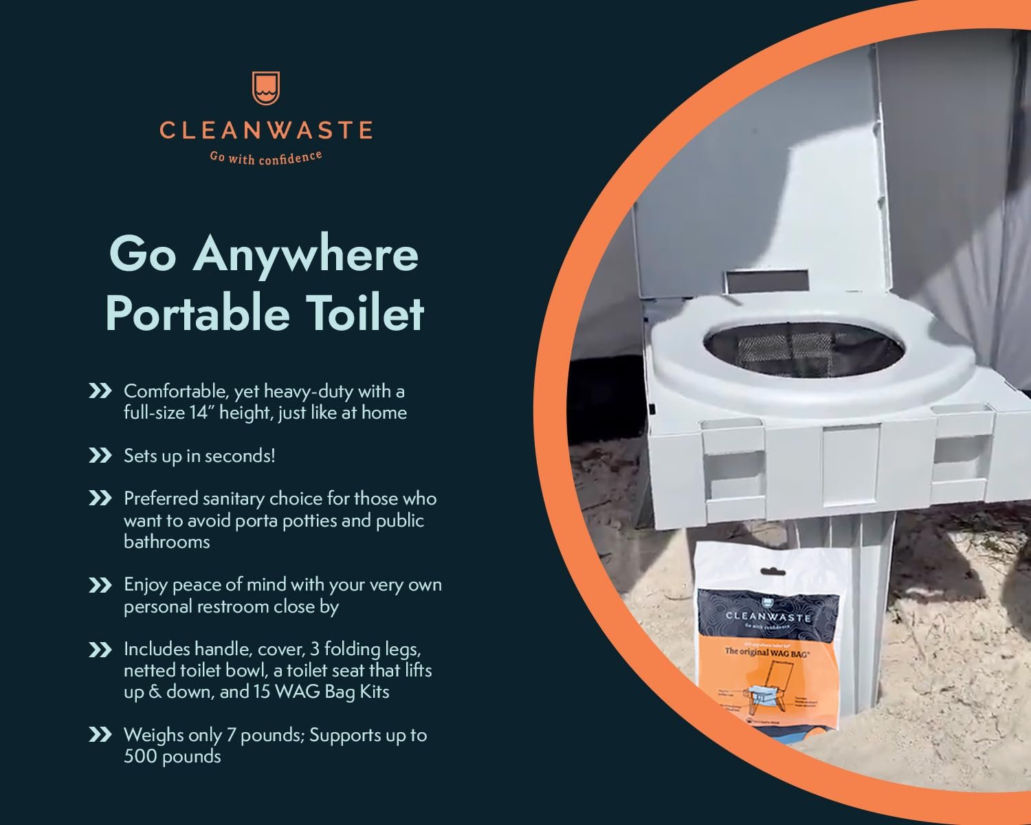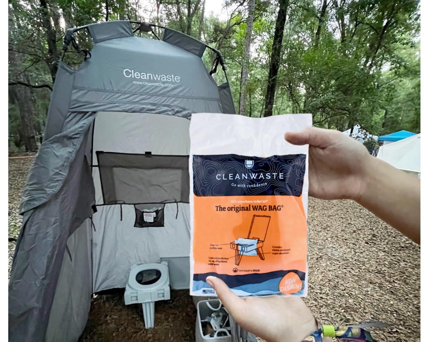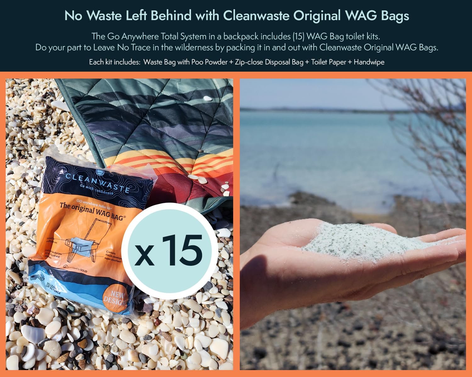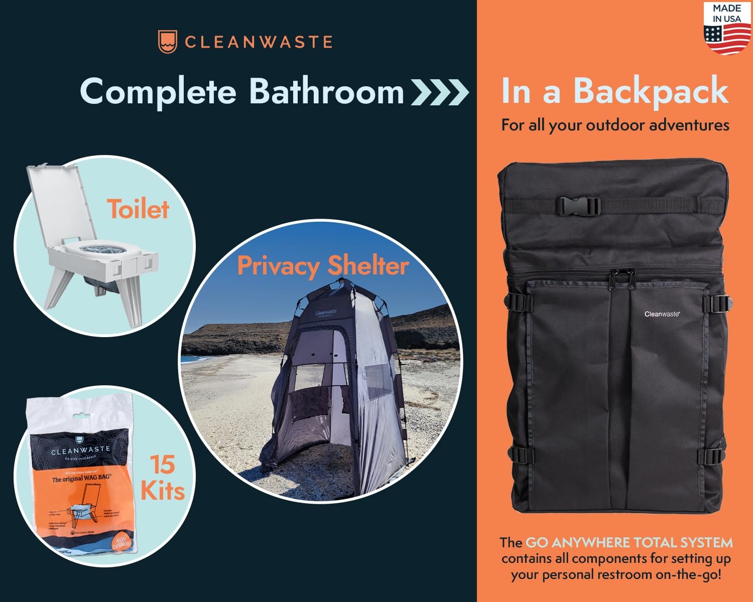 Wherever and whenever bathroom facilities are out of reach, unsafe or unsanitary, reach for Cleanwaste Complete GO Anywhere Toilet System – safe, private, portable, easy, and green. Ideal for outside work or play, military deployment, camping, an extra bathroom, tailgate parties – and don’t forget to include one in your emergency supplies. Each system includes 1 Go Anywhere Portable Toilet, 1 Go Anywhere Privacy Shelter, 15 Go Anywhere Toilet Kits, 1 large transport bag for used kits, 1 backpack that stores everything.