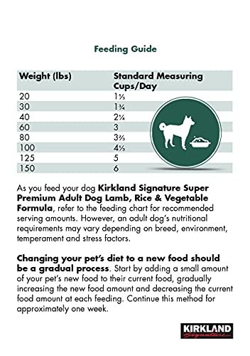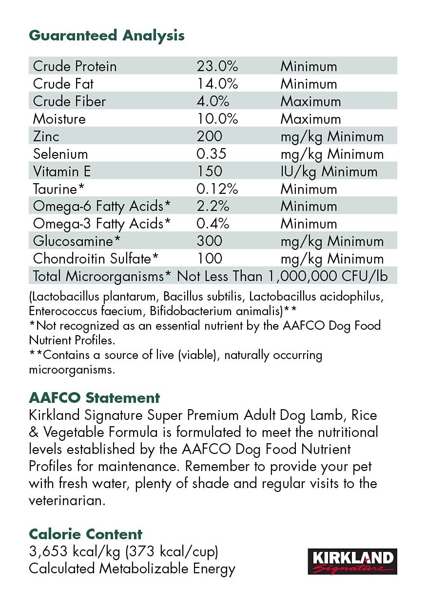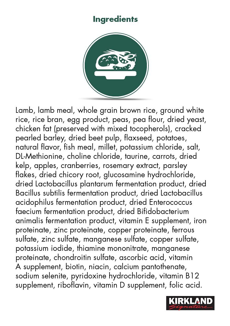 Kirkland Signature Super Premium Adult Dog Lamb, Rice & Vegetable Formula is designed to meet all of the nutritional needs of your special pet. For dogs that thrive on lamb-based diets, our real lamb and egg make an ideal protein blend. Plus whole grain brown rice, the No. 1 carbohydrate ingredient in our Kirkland Signature Super Premium Adult Dog Lamb, Rice & Vegetable Formula, is a highly digestible carbohydrate source. This real lamb formula is enhanced with probiotics for optimal digestive health and enriched with garden vegetables, fruits and herbs.