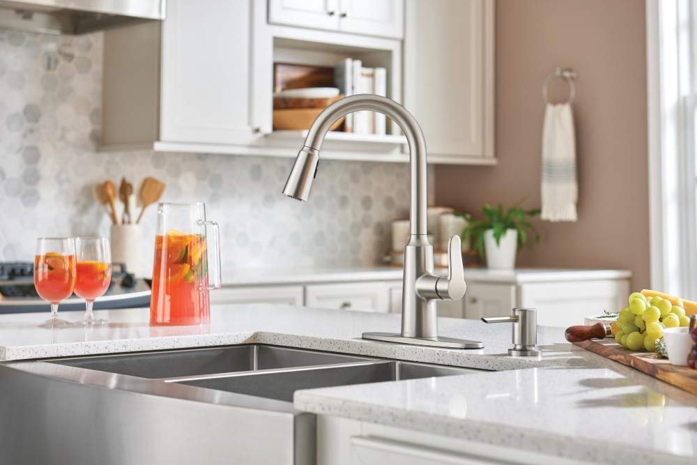 Combining modern functionality with ageless style, the Edwyn one-handle pulldown kitchen faucet adds perfectly balanced design to any kitchen. The pulldown spray head is equipped with the Reflex system for smooth operation, easy movement, and secure docking. Two spray functions allow you to switch effortlessly between an aerated stream for everyday cleaning and a powerful rinse for heavy-duty applications, with an exceptionally strong, concentrated spray thanks to Power Clean technology. The single-lever design makes it easy to control water temperature and pressure, while the high-arc design makes it easy to wash and fill large pots and pans. The Edwyn one-handle pulldown kitchen faucet features the Duralock Quick Connect System for easy installation, and can be mounted on one-, two-, three-, or four-hole sinks and countertops. This faucet comes in a Spot Resist stainless finish that resists fingerprints and water spots to keep your kitchen looking cleaner, and includes a soap dispenser so you can fully coordinate your kitchen decor.