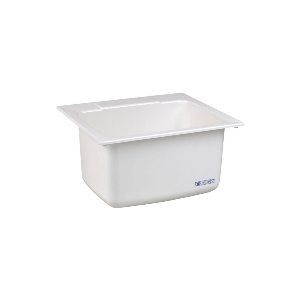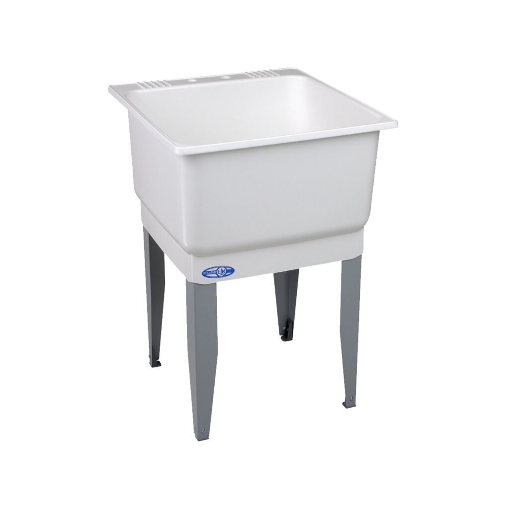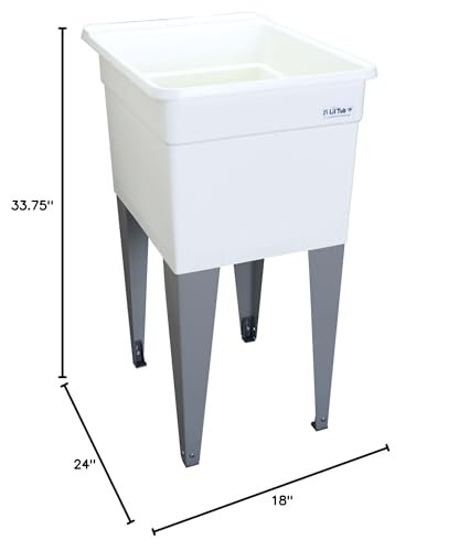 This is a Mustee floor-mount laundry tub in the color white. It is one piece molded tub of impact-resistance polypropylene which is an extra narrow 18″ wide, allowing it to fit where other tubs cannot. This laundry tub features a 15 gallon capacity tub with smooth surface and finished steel legs with adjustable levelers. Included is a leakproof, integrally molded-in drain with stopper. Connects to standard 1-1/2″ P or S trap.