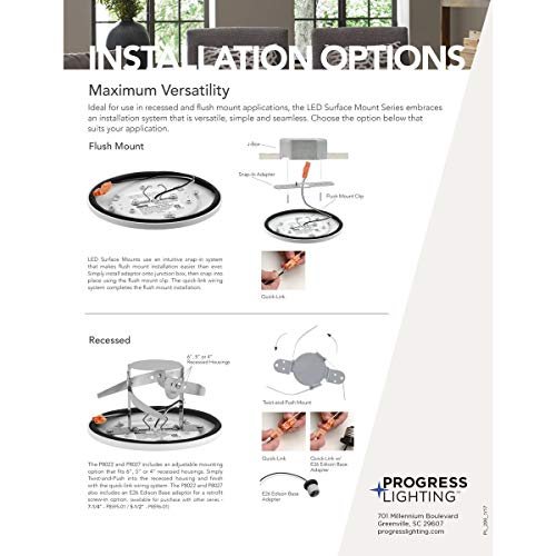 Unite performance, cost, and safety benefits with the LED Flush Mount Collection 1-Light 7-1/4-Inch White LED Modern Round Flush Mount. An LED light source glows from within a diffused polycarbonate lens that offers direct glare control. The die-cast aluminum frame is coated with a crisp white powder coat paint finish to accentuate the surface mount’s contemporary aesthetic. For ideal illumination, an integrated LED light source is included (17.3w). Flicker-free dimming to 10% brightness with many triac-forward phase dimmers. Offers simple snap-in installation into a standard J-box. The flush mount’s sleek design is ideal for both commercial and residential applications such as closets, pantries, hallways, and bathrooms in modern and transitional style settings. It’s time to breathe new life into the mundane every day with timeless and truly transformative lighting. Make your purchase today to begin your journey to a whole new lighting experience. Progress Lighting products are designed for exceptional quality, reliability, and functionality.