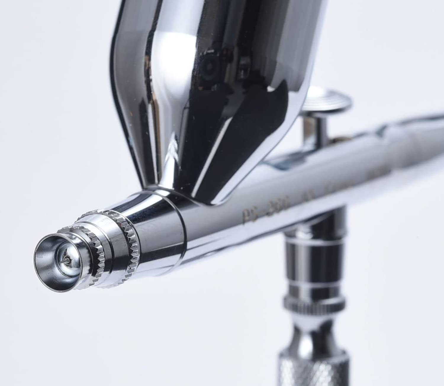 The perfect airbrush for spraying a metal color or surface layer over a large area. This airbrush provides stable spraying even under low pressure. The 15-cc large cut of the direct-mount type makes it easy to wash. This airbrush has a 1/8 (S) mouth with joint for PS (fine).