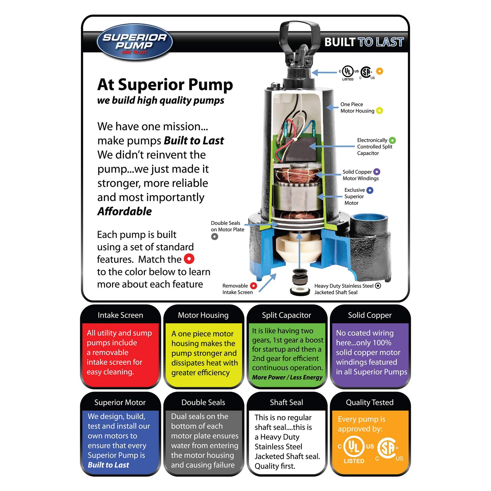 Superior Pump builds pumps that are truly Built to Last and are 100 percent factory tested. Superior Pump uses quality components including solid copper motor windings, heavy duty stainless steel jacketed shaft seals, double o-ring seals on motor plate, and electronically controlled split capacitors. Superior Pump model 92511, 1/2 HP cast iron submersible sump pump with vertical float switch, will move water up to 4200 gallons per hour. Equipped with suction screen to filter out large debris and handles up to 1/2-inch solids with ease. This pump is UL/CUL listed and CSA certified and backed by a 3 year warranty.