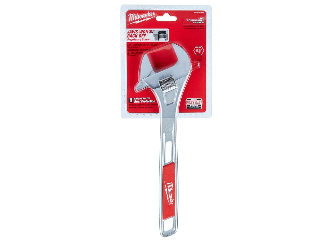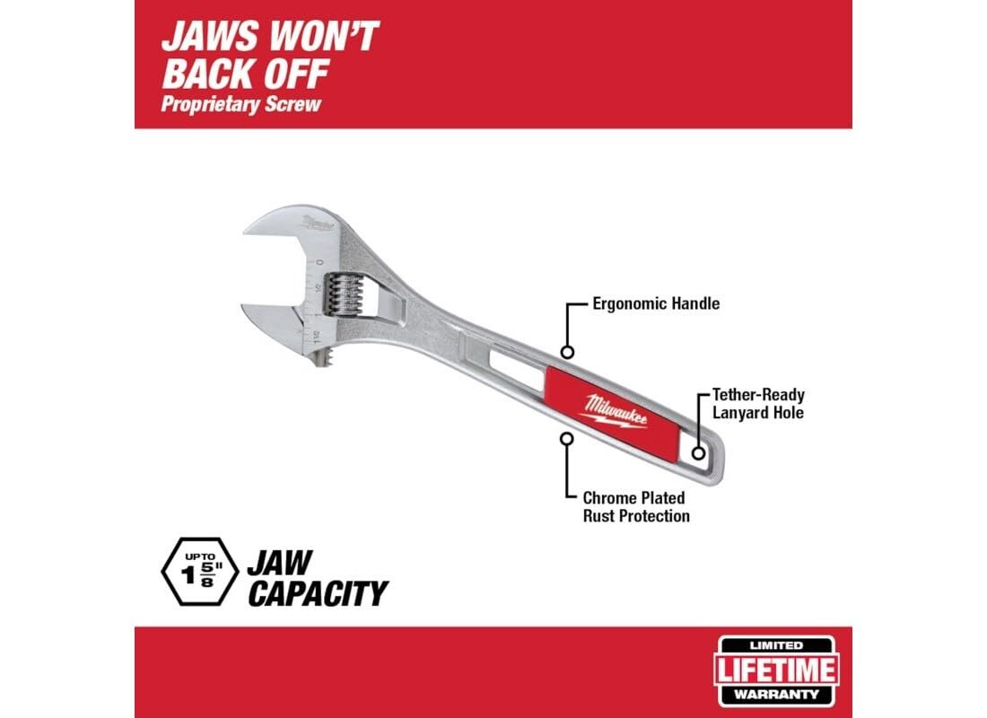Drop forged and heat-treated carbon steel construction with a corrosion-resistant satin chrome plated finish. Precision-machined slide jaw and worm gear allows for exact fastener fit and smooth adjustment. Adjustable wrench can take on bicycle repair and furniture assembly.