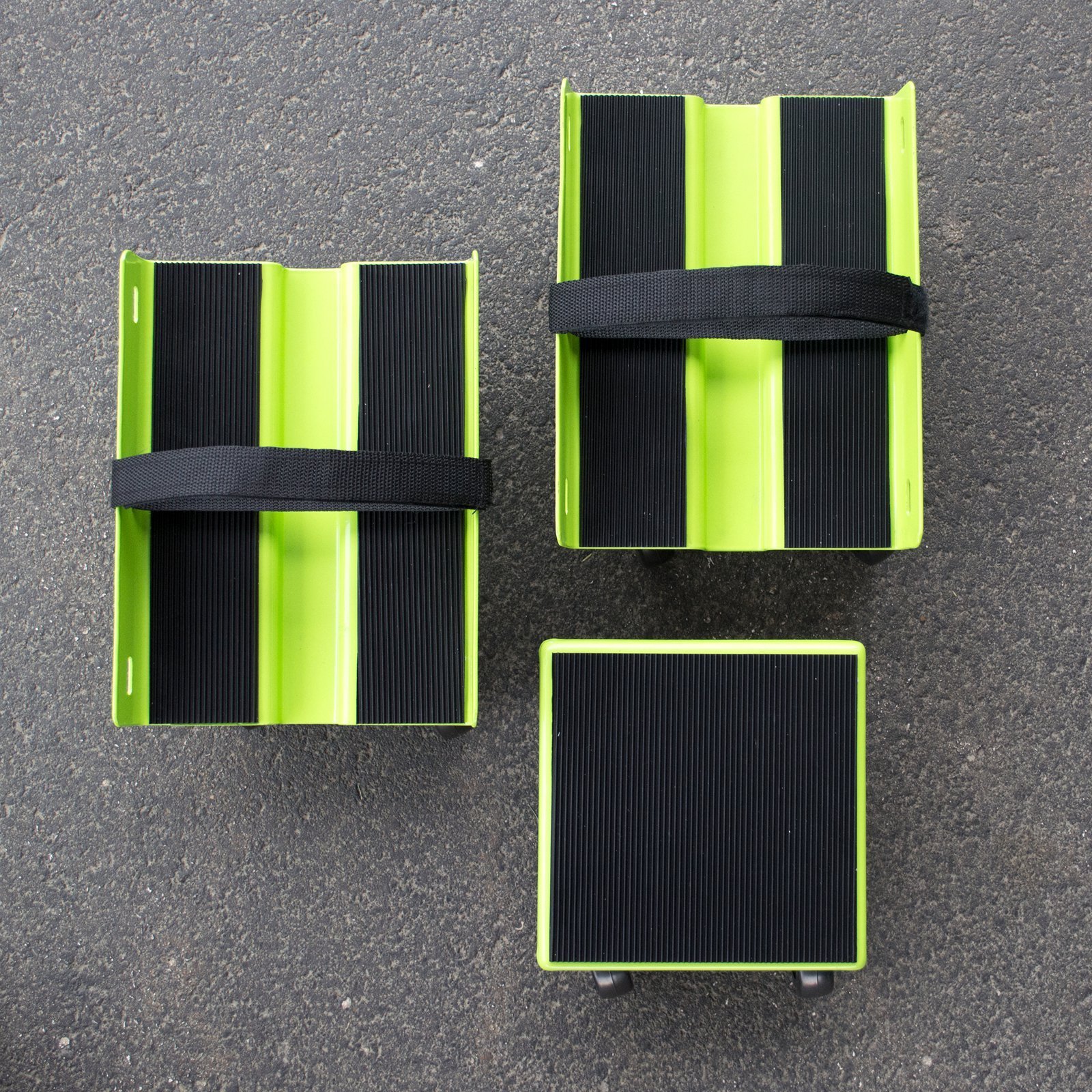 Ideal for maneuvering snowmobiles in storage areas, the Black Bull 1500 lbs capacity snowmobile dolly set can make storing your ride much easier. Get your snowmobile off the garage floor, and reduce damage and frustration. Heavy-grade steel with a rust-resistant powder coat finish can handle vehicles up to 1500 lbs. Four, 360-degree swivel casters on each platform make maneuvering easy, and 3 separate padded platforms provide a custom and universal fit. The 2 front ski platforms feature a grooved design and a nylon tie-down strap; the third flat platform fits under the rear track.