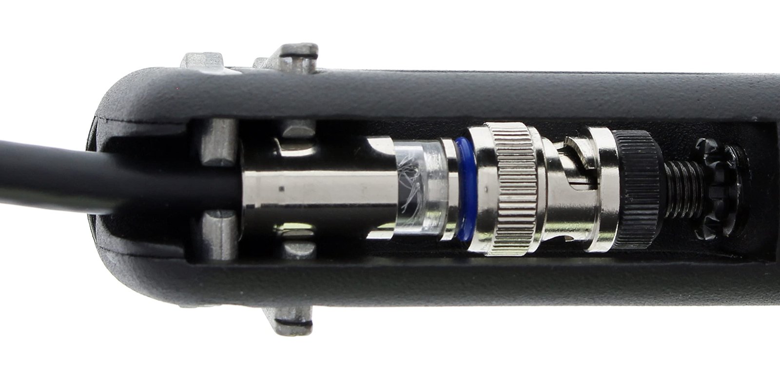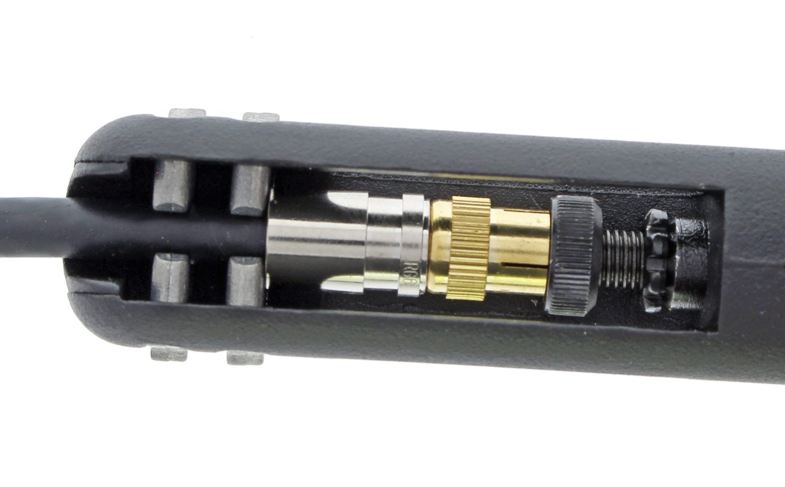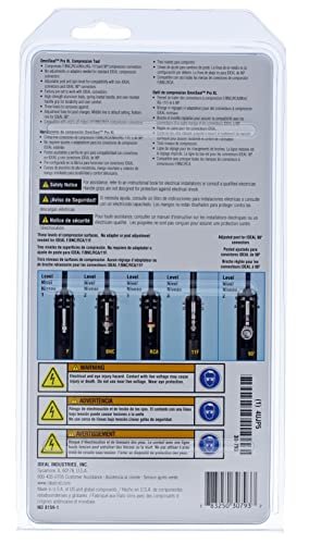 Our flagship OmniSeal Pro XL (30-793) compression tool is compatible with and terminates all IDEAL compression connectors. Patented dual spring clips and fixed top ledge enable this tool to compress more connectors than any other tool on the market. Unlike most compression tools which require adjustments and adapters for each type of connector, this compact 6¾“ length tool compresses all straight IDEAL compression connectors with no adjustments to the tool. F/BNC/RCA/RG-11 F connectors can all be terminated one after another with no setting changes. Only the 90° F and BNC connectors require a tool adjustment. An adjustable spin knob allows for compressive forces to be placed on the rim of the connector instead of the bottom of the nut when required. This is helpful for non-IDEAL plastic centered connectors such as 50Ω BNC‘s or RCA‘s with limited structural support. It can also be used as a larger flat surface to compress against for other types of non-traditional compression connectors. The adjustable post and spin knob, combined with three compression surface levels, give the installer virtually unlimited options for compressing current and future connector designs.
