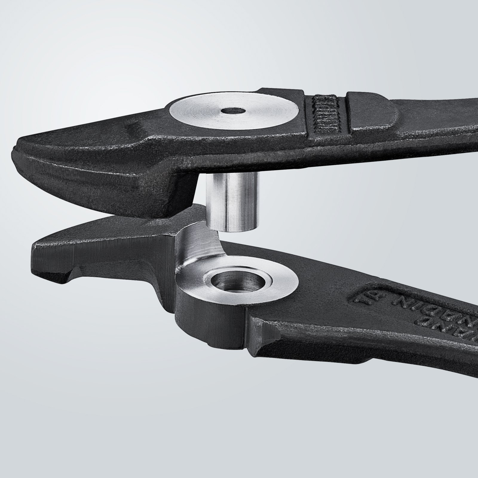 High leverage Diagonal cutters for very tough, continuous use. High cutting performance with minimum effort due to optimum co-ordination of the cutting edge angle and transmission ratio. Precision cutting edges additionally induction hardened (cutting edge hardness approx. 64 HRC), for all sorts of wire including piano wire. The 250-mm-long Diagonal Cutter is suitable for copper Conductors up to 16 mm² and aluminium Conductors up to 35 mm².