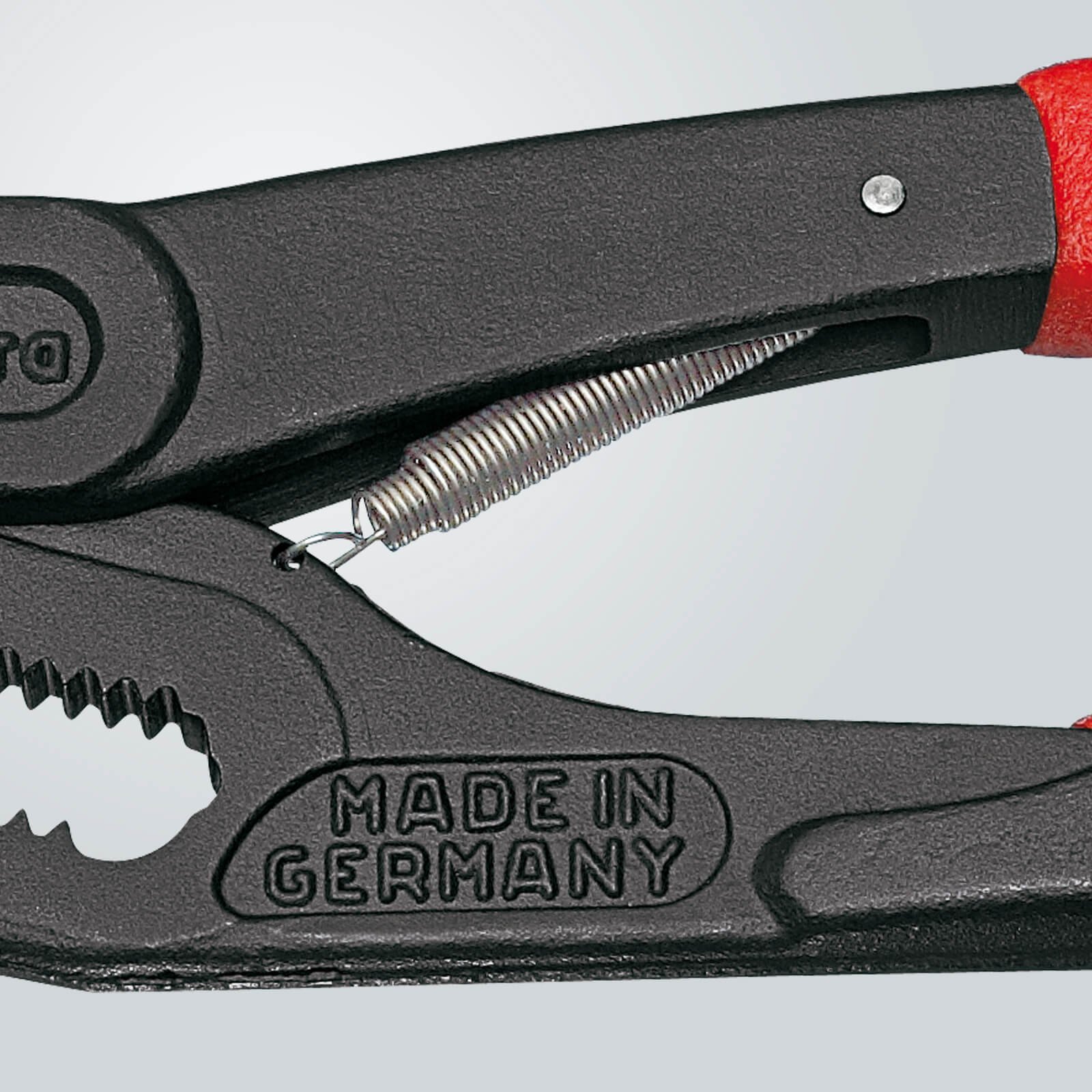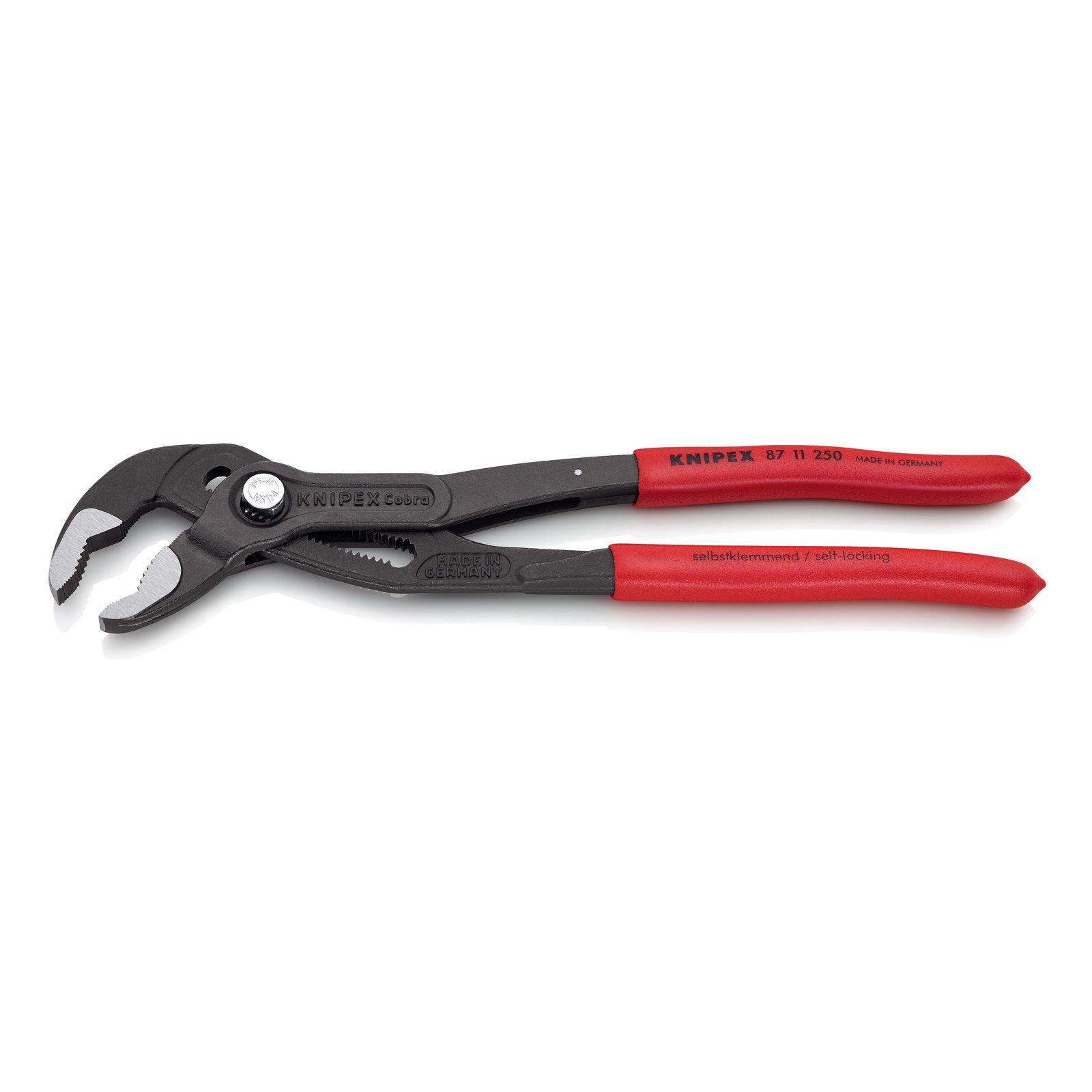 All features of the Knipex Cobra 87 01 250. Automatic adjustment at the touch of a button directly on the workpiece. The sheltered positioned spring ensures that the pliers close automatically once the push-button is activated .