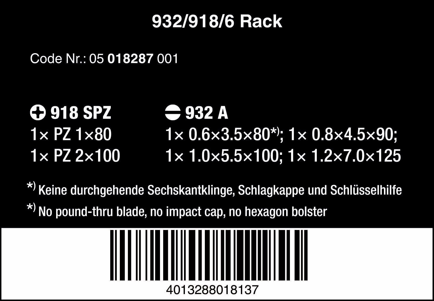 Wera Tools 05018287001 932/918/6 RACK SET