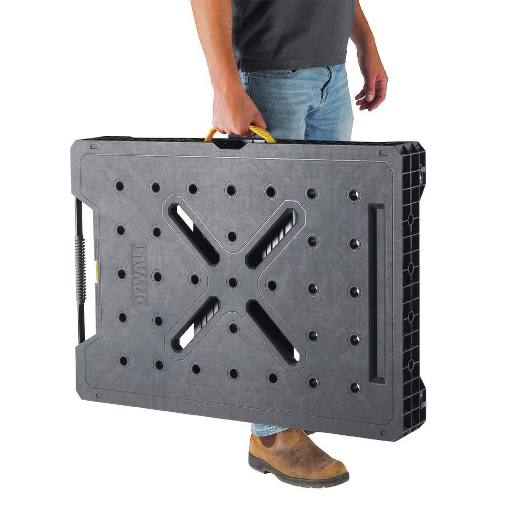 The Express Folding Workbench allows you to create a workspace anywhere in under 3 seconds. It is compact and easy to maneuver around a jobsite or garage and nicely folds for compact storage. The large work surface with holes throughout allow for easy clamping during difficult projects. Its metal legs support 1,000 lbs of weight, great for those heavy-duty projects.