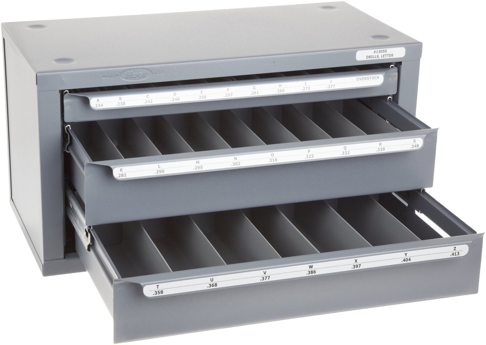 The Three-Drawer Huot Drill Bit Dispenser Cabinet holds one package each of jobber length drill bits in letter sizes from A to Z and is made in USA. The labeled compartments provide quick identification and organization. The cabinet is made of steel with an epoxy finish for durability and protection and can be stacked with other Huot dispenser cabinets. Drill bits are not included. The cabinet is 7.75 × 14.625 x 7.375 inches (H x W x D). (H is height, the vertical distance from lowest to highest point; W is width, the horizontal distance from left to right; D is depth, the horizontal distance from front to back.)
