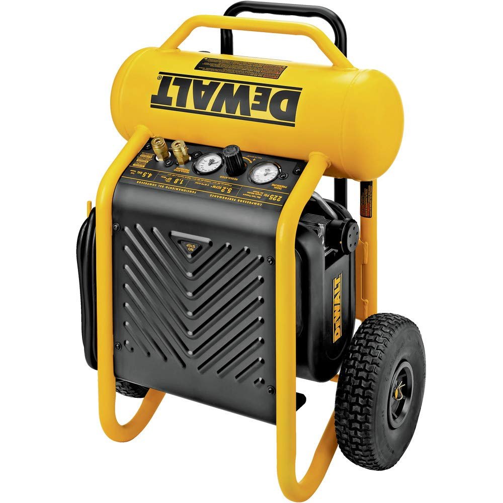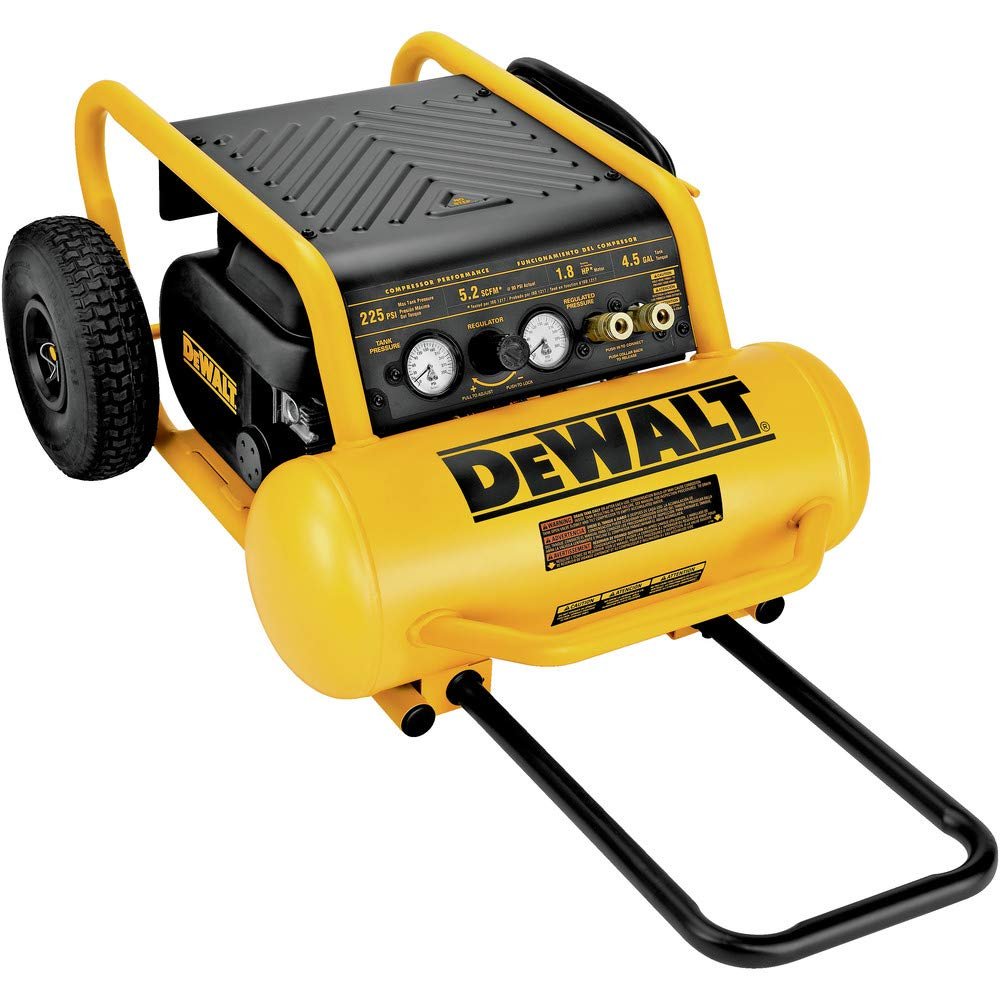 DEWALT built the D55146 Heavy Duty 4.5 Gallon, 200 PSI, Heavy Duty Hand Carry Compressor with Wheels is quiet, efficient and solidly built; constructed to withstand harsh jobsite conditions. Its dual connections allow users to simultaneously operate up to 3 framing nailers or 2 roofing nailers. This versatile compressor is useful to both small framing carpenters & remodelers and large trim carpenter crews & remodelers alike. The unique, patented high efficiency motor and high pressure pump provide a maximum pressure of 200 PSI with 5.2 SCFM @ 90 PSI so you never lose pressure. The D55146 is convenient, with an oil free, maintenance free pump and is easy to move & store with pneumatic wheels. It’s the perfect compressor to choose if you need a lot of power and a low maintenance tool.