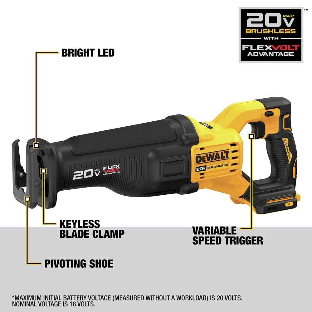 Take advantage of more power with the DEWALT 20V MAX* Reciprocating Saw with FLEXVOLT Advantage tool technology. The DEWALT Reciprocating Saw has up to 50% more power when paired with a DCB606 60V MAX* FLEXVOLT battery vs a DCB205 DEWALT 20V MAX* battery. Battery and charger sold separately.