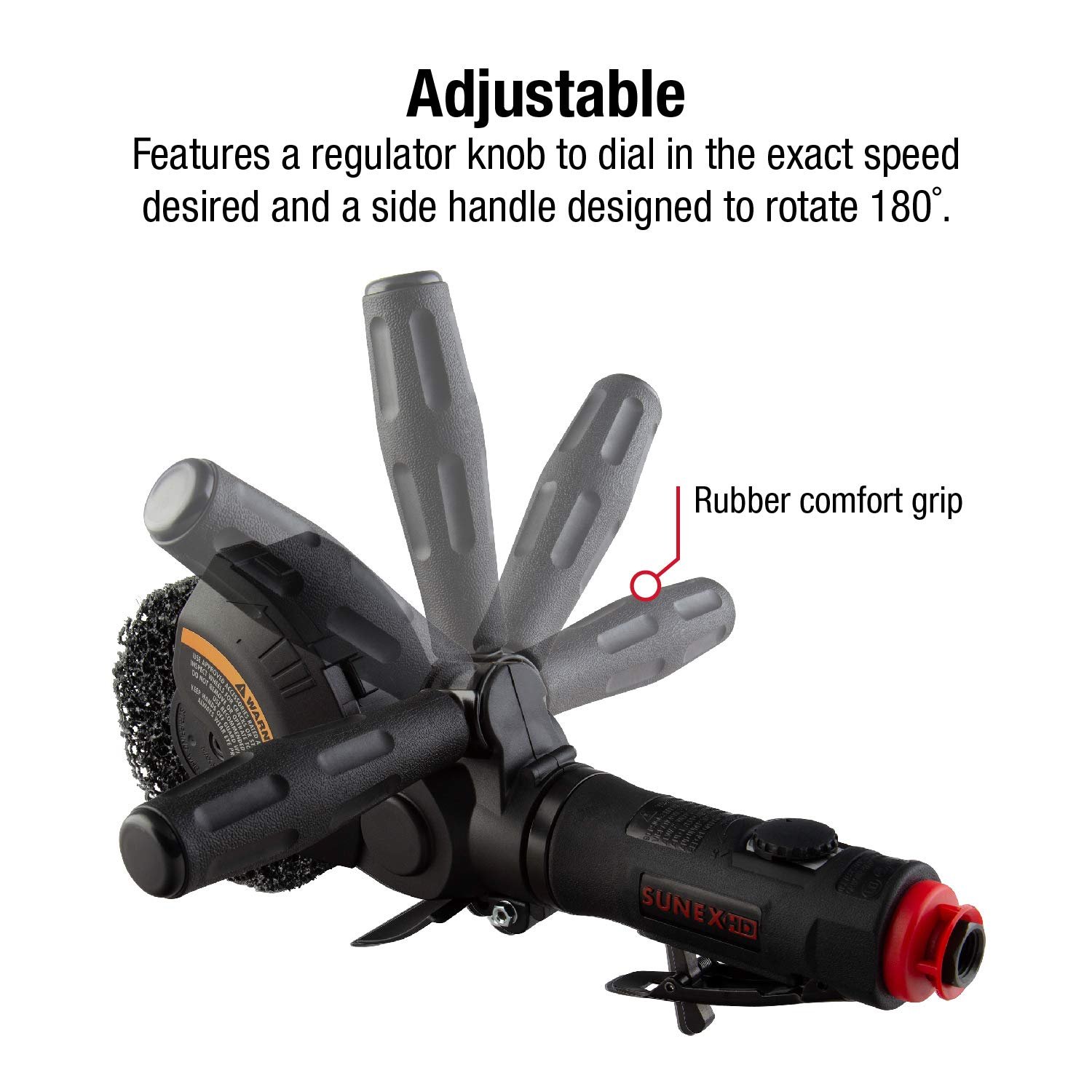 The SUNEX TOOLS HD new SX8200 Surface Blaster Kit gives you power, lightweight, comfort and durability. With it’s 180 rotating side handle, you can move the side handle to position most suitable for ergonomic efficient work. With the 5 different wheels included in this kit, you will have the accessory needed to efficiently remove rust, paint, gaskets, pin stripes and stickers, along with many other material removal needs. Comes with: 1 piece Surface Blaster tool, 1 piece Rubber Eraser Wheel, 1 piece Pin Strip Stripping wheel, 1 piece Hub, 3 pieces wire wheels.
