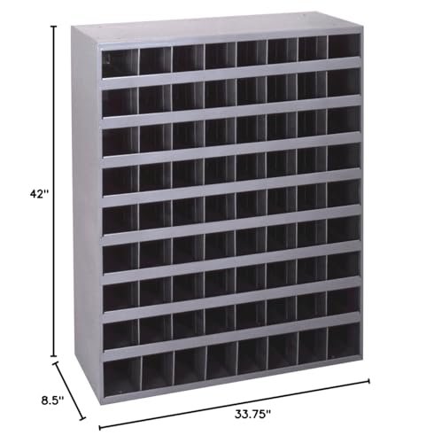 72 Opening Bin. All welded, prime cold rolled steel. Fully hemmed 1-1/8″ bin fronts to hold labels and retain parts. Roll-formed sides for increased strength and stability. Modular with all other 9″ deep bins. Mounting holes are located in both the top and bottom. Optional doors, base and bin labels available. Durable gray powder coat finish. Ships fully assembled. 72 Bins. Measures 33-3/4″ width by 42″ height by 8-1/2″ depth.