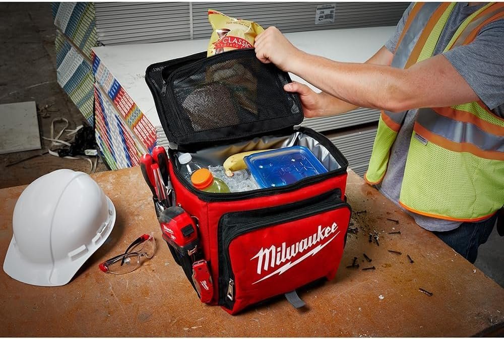 Milwaukee, Jobsite Insulated Cooler, Designed To Be Durable Enough To Withstand Tough Jobsite Conditions, Holds Ice For 24 Hours, Dry Storage Compartment, No Sweat Exterior, 3 Pockets Inside & 5 Pockets Outside, All Metal Hardware, 2X The Insulation, Padded Shoulder Strap, Food Grade Leak Proof Liner, 1680D Ballistic Material Weather Resistant Base, Heavy Duty Metal Zippers, Tape Measure Clip With Bottle Opener, Tech Pocket For Storing Tablets & Electronic Devices. Milwaukee, Tech Pocket For Storing Tablets & Electronic Devices.