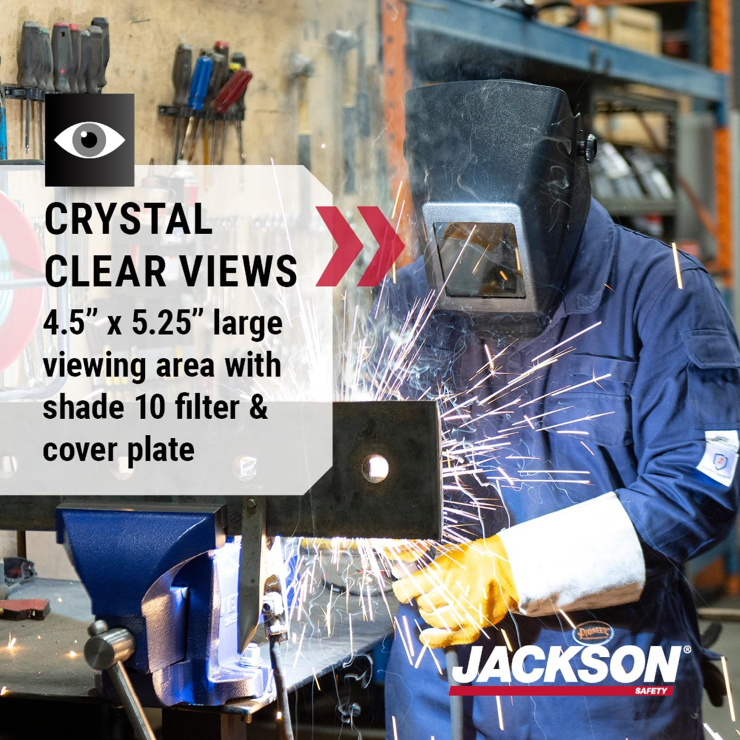 The Jackson Safety Fixed Shade Welding Helmet (W10 HSL 100) features a narrow shell design that’s best for working in tight spots. The standard shade 10 filter plate and cover plates are factory installed. This durable shield is hard hat adaptable, comfortable & offers a large field of view for clear vision of the weld puddle. Use with MIG (metal inert gas), ARC, or TIG (tungsten inert gas) welding. Additionally, this product is adaptable to upgraded Jackson Safety ADFs like Insight, NexGen, and TrueSight II. The welding mask has an extended front, which increases throat protection from sparks, slag, fumes, and other physical hazards. It is CSA compliant and meets ANSI Z87.1 standards. Established in 1933, Jackson Safety has built a century long reputation for delivering the most innovative safety solutions in the welding and personal protective equipment industries. When it comes to providing safety solutions with long-lasting value, durability and comfort, Jackson Safety has set the standard. Whether the need is for welding protection in a steel fabrication environment, head protection on a construction site, or hearing protection at an airport, Jackson Safety provides the widest range of safety choices to meet the needs of every job and every worker.