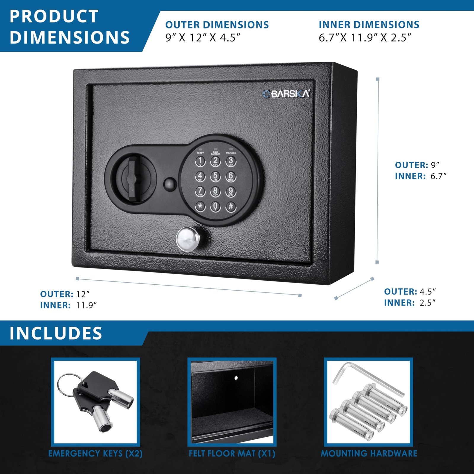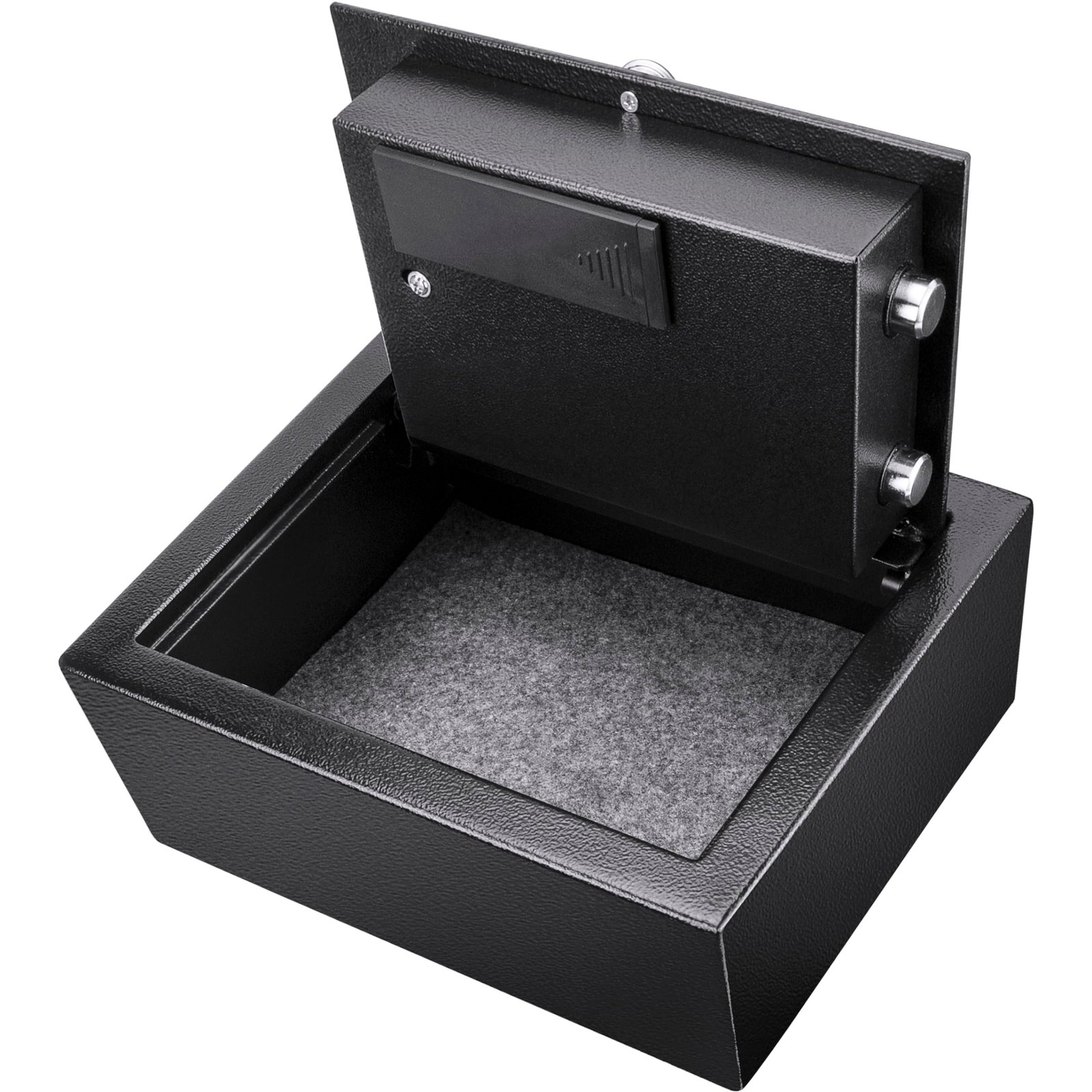 The compact size of the Top Opening Keypad Safe allows it to be placed in discreet, out-of-the-way locations while retaining enough interior space to store multiple small items. The Top Opening Keypad Safe is ideal for storing jewelry, money, passports, compact electronics, wallets, and much more. With your purchase you receive the Top Opening Keypad Safe, protective floor mat, 2 back-up keys and mounting hardware.